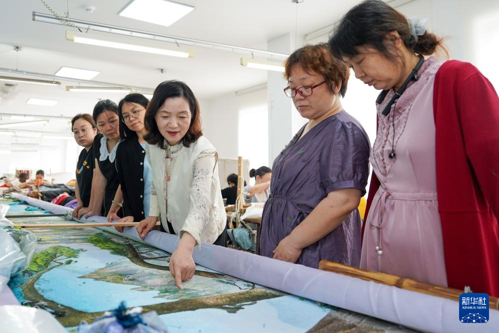 7月3日,国家级非遗项目(苏绣)代表性传承人姚建萍(右三)在工作室内与绣娘交流苏绣技艺。