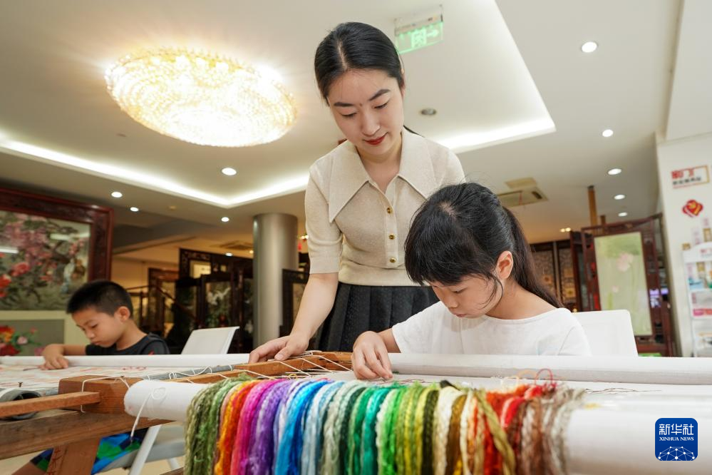7月2日,在苏绣小镇的一家苏绣工作室,工作人员在指导小朋友体验苏绣。