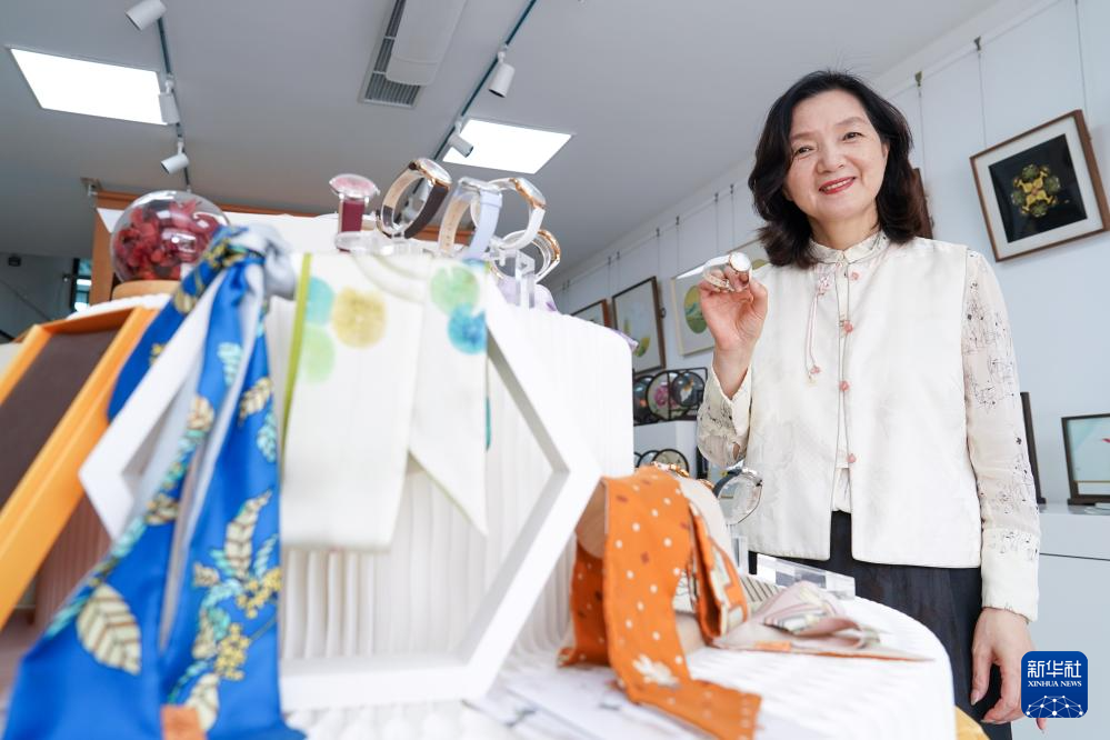 7月3日,国家级非遗项目(苏绣)代表性传承人姚建萍在工作室内介绍融合苏绣元素的腕表等产品。