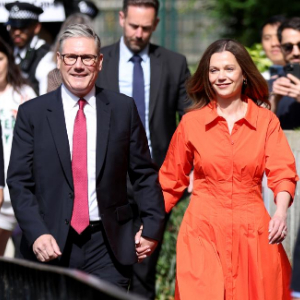 7月4日,在英国伦敦,英国工党领袖基尔·斯塔默与妻子前往一处投票站,准备投票。