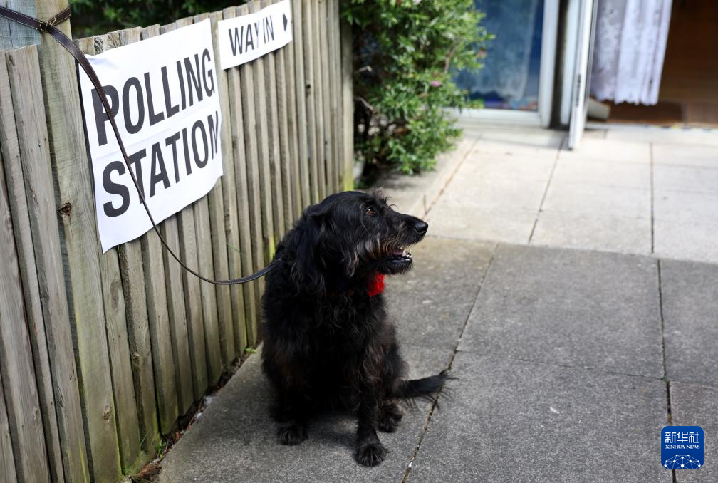 7月4日,在英国伦敦,一只小狗在一处投票站外等待主人。