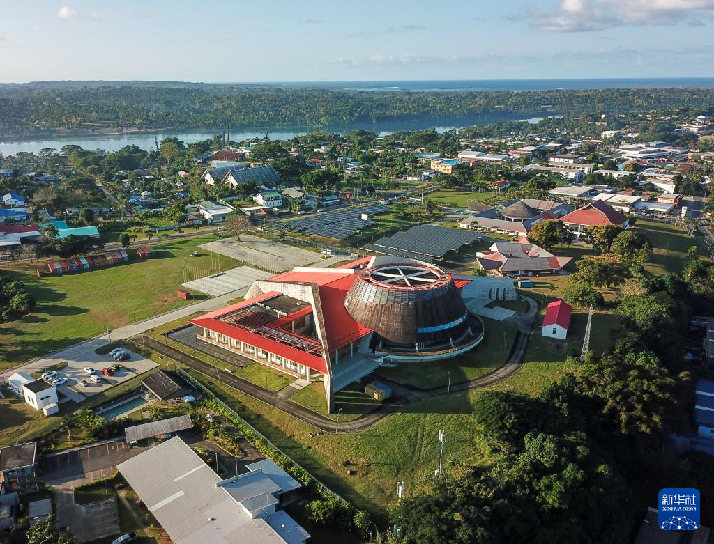 这是6月29日在瓦努阿图首都维拉港拍摄的瓦努阿图国家会议中心(无人机照片)。