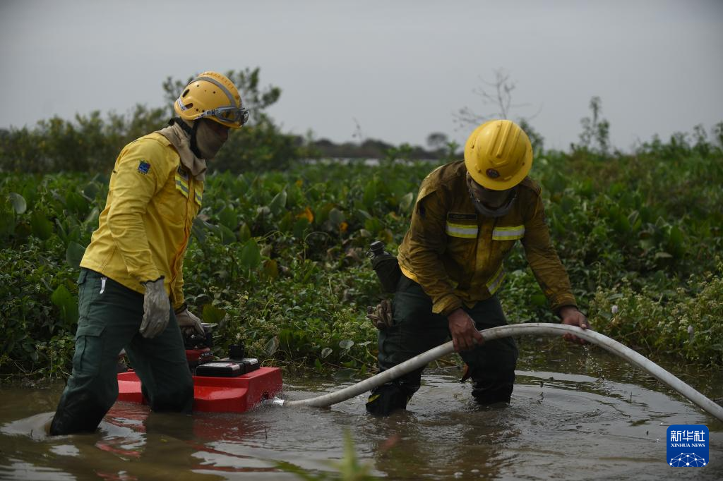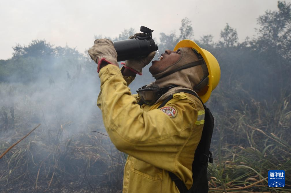 7月7日,消防员在巴西南马托格罗索州潘塔纳尔湿地参加灭火行动间隙补充水分。