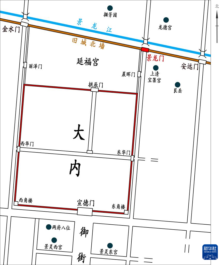 江苏淮安庆成门遗址发掘区航拍示意图。