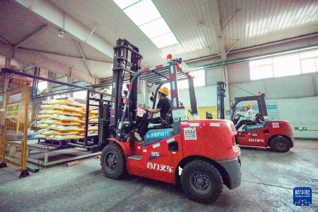 7月23日,工人操作叉车在河北省隆化县一家化肥企业车间搬运化肥。