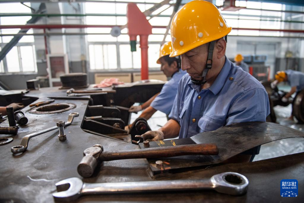 7月25日,在国铁北京局北京大型养路机械运用检修段的检修库,职工安装机械车传动轴。
