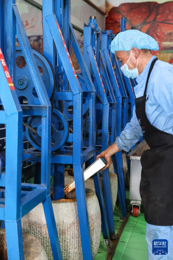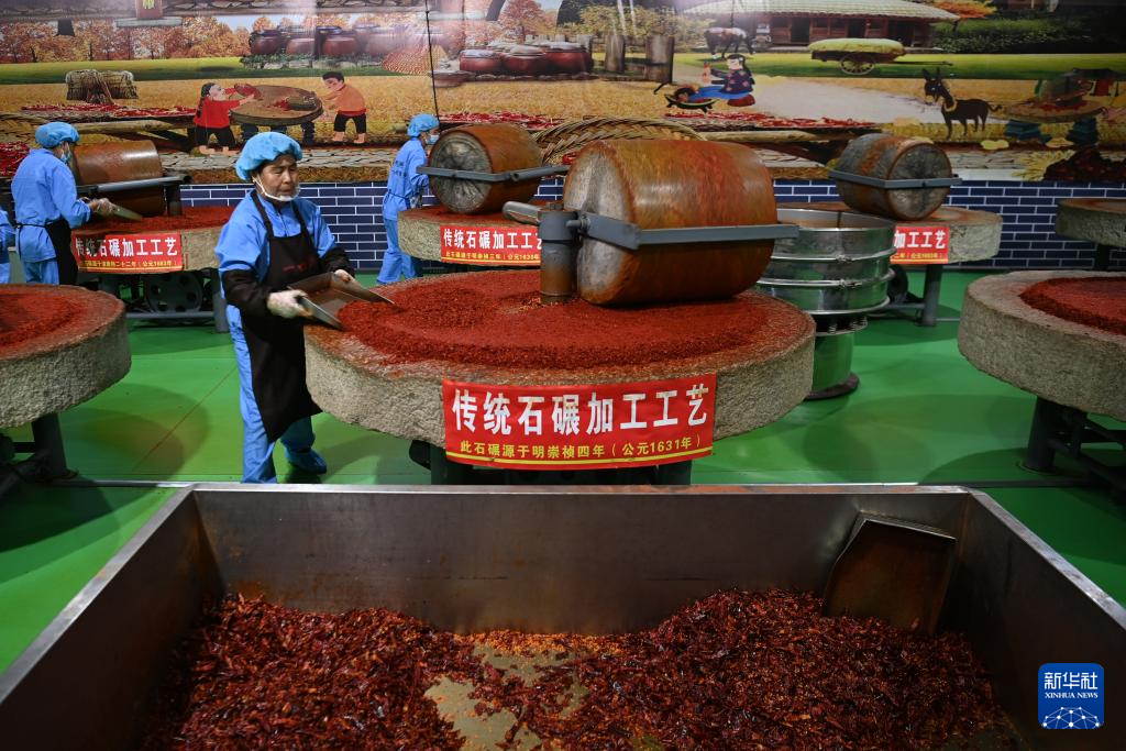 7月22日,工作人员在甘肃天水市甘谷县安远镇的辣椒烘干和加工车间里操作电动石臼。