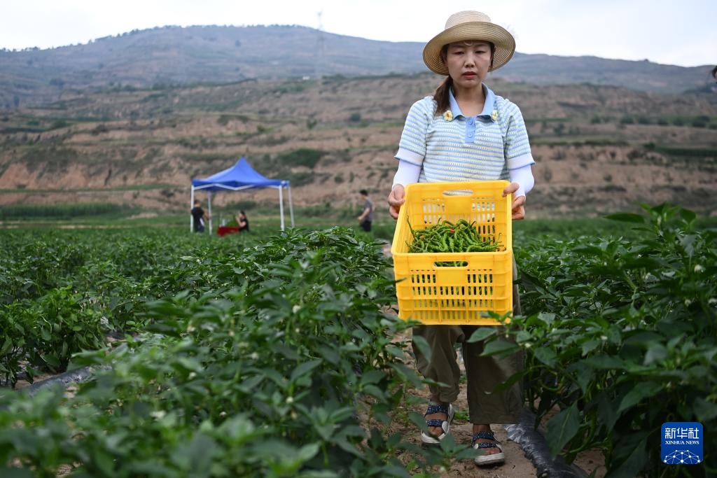 7月22日,在天水市甘谷县新兴镇侯家沟村的辣椒生产基地,工作人员采摘绿辣椒。
