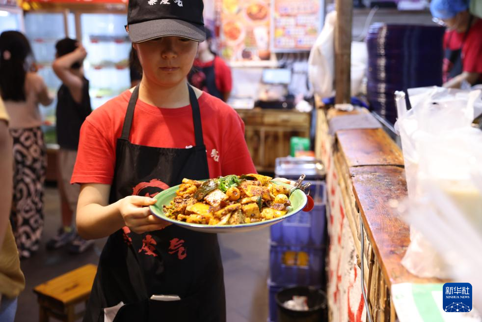 7月22日,工作人员在甘肃天水古城的一家麻辣烫店里上菜。