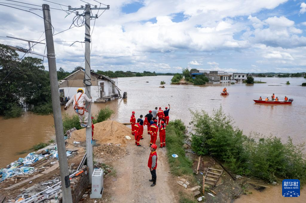 7月29日,在湖南省湘潭县易俗河镇四新堤决口现场,抢险人员处理决口附近的电线(无人机照片)。