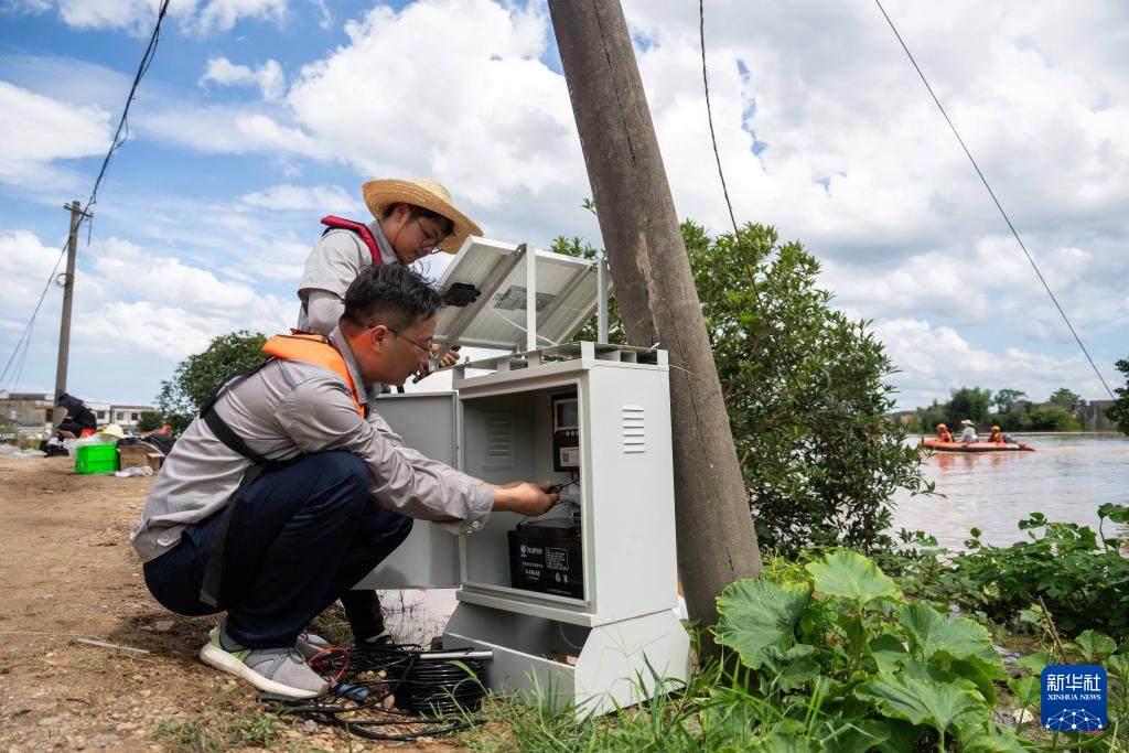 7月29日,在湖南省湘潭县易俗河镇四新堤决口现场,抢险人员安装水文遥测仪。