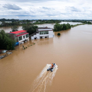 7月29日,在湖南省湘潭县易俗河镇四新堤附近,抢险人员搜寻被困群众(无人机照片)。