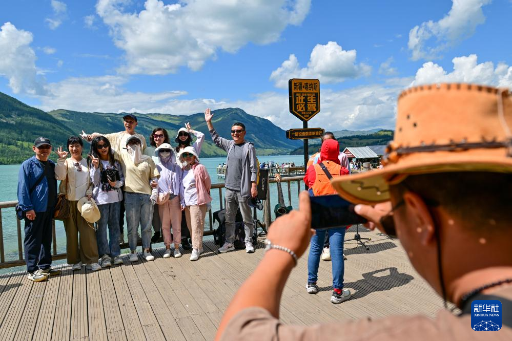 游客在新疆布尔津县七彩河休闲旅游度假区拍照(7月21日摄)。