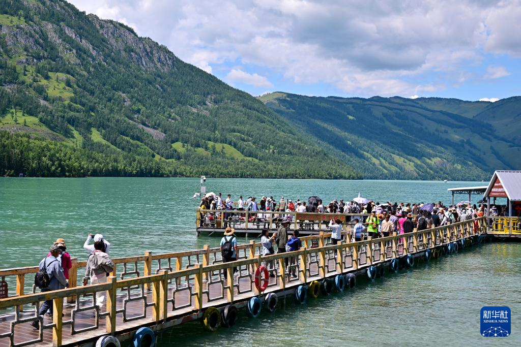 游客在新疆阿勒泰地区喀纳斯景区观光游览(7月22日摄)。