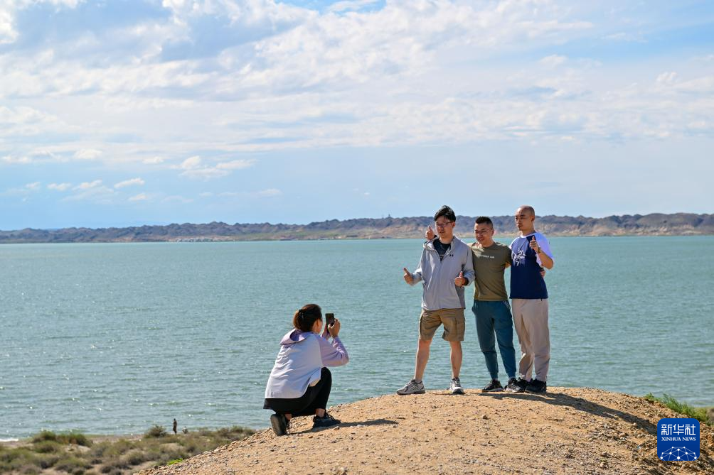 游客在新疆阿勒泰地区福海县乌伦古湖合影留念(7月21日摄)。