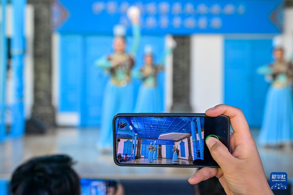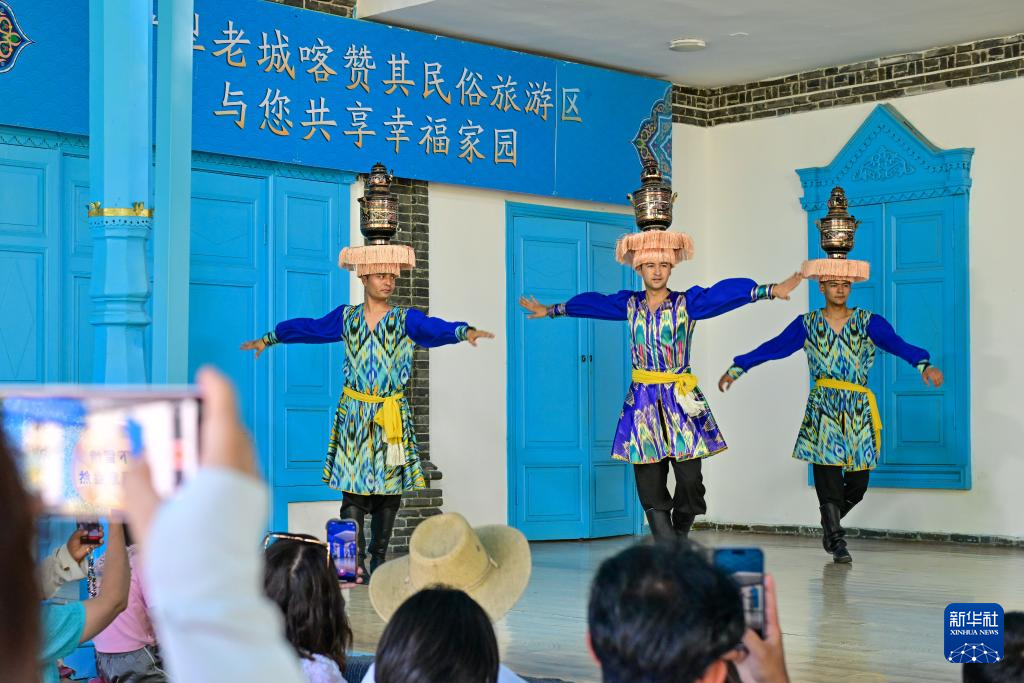 在伊犁哈萨克自治州伊宁市喀赞其民俗旅游区,游客在锡伯车马店欣赏文艺表演(7月27日摄)。