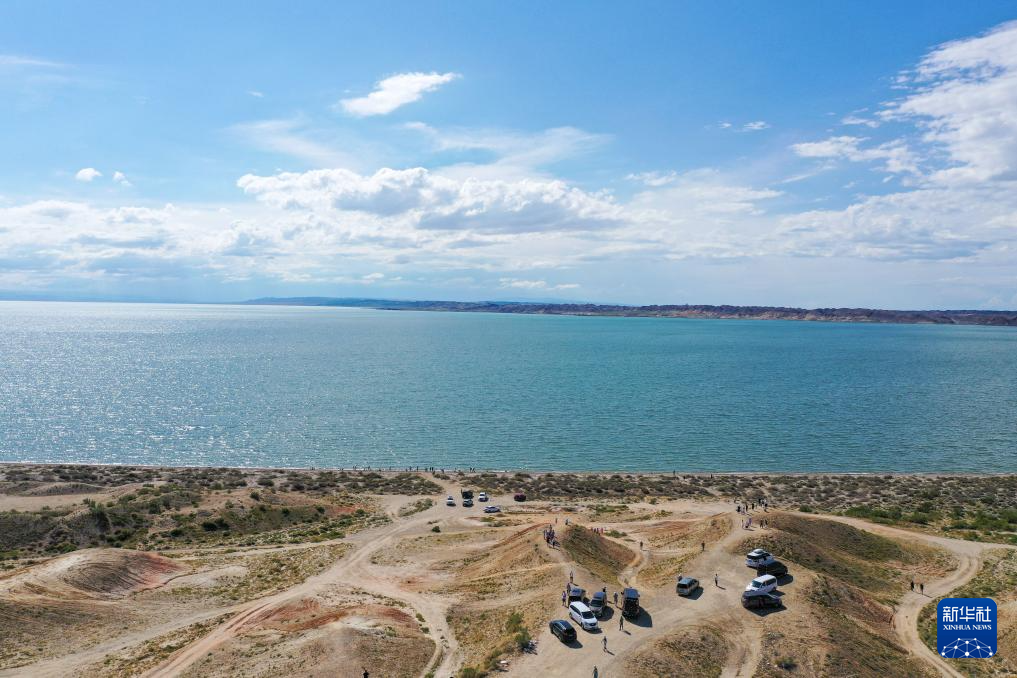 游客在新疆阿勒泰地区福海县乌伦古湖观光游览(7月21日摄)。