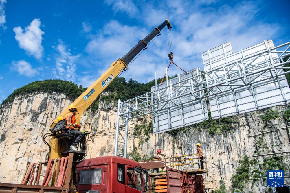 8月2日,工人在渝湘复线高速彭酉路标段建设现场进行高速公路附属设施安装工作。