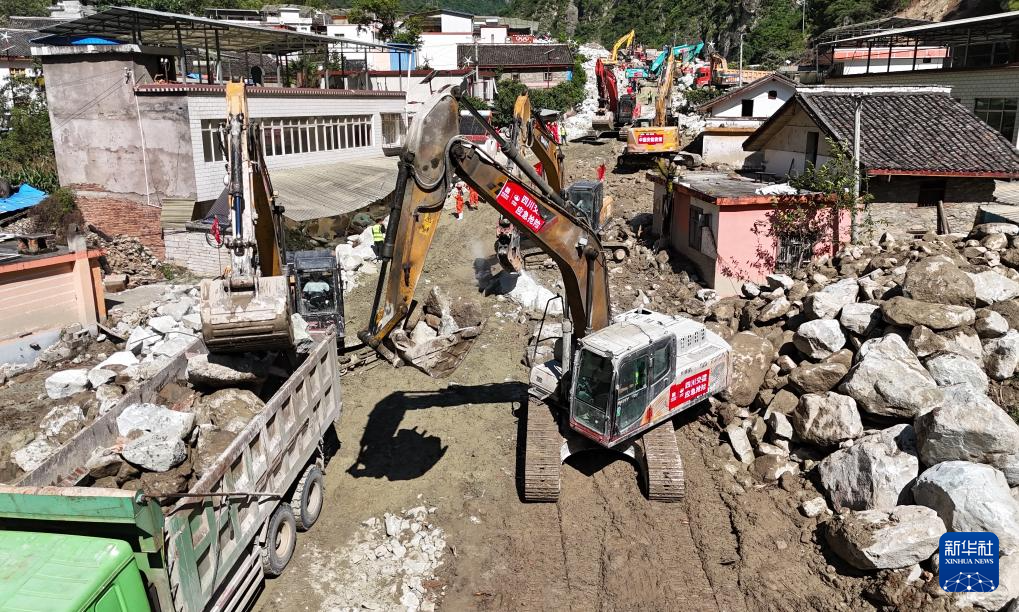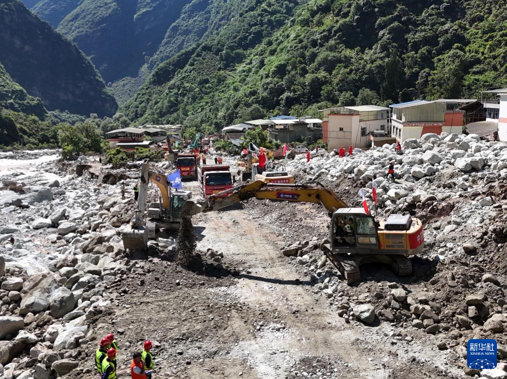 8月5日,在四川甘孜州康定市姑咱镇日地村,救援人员操作机械疏通国道318线(无人机照片)。