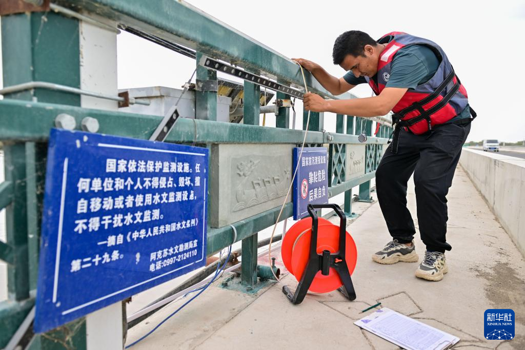 在新疆阿克苏地区沙雅县盖孜库木乡,阿克苏水文勘测局的工作人员在盖孜库木大桥防洪段收集水文信息(8月3日摄)。