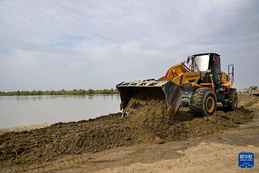 在新疆阿克苏地区沙雅县盖孜库木乡吐央村,抢险人员驾驶大型机械进行堤坝加固(8月3日摄)。