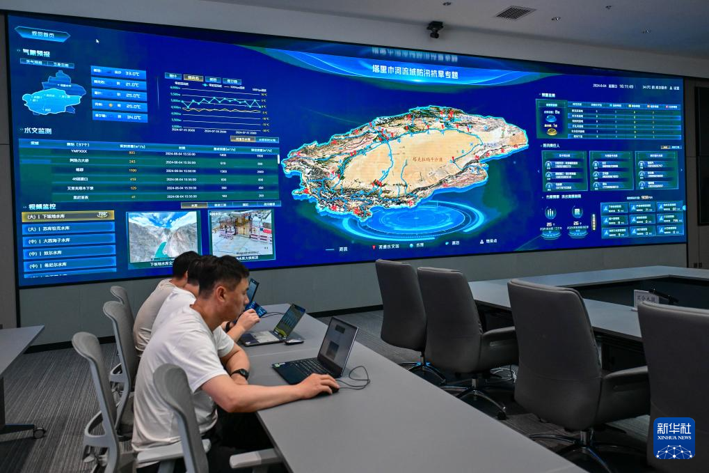 在新疆塔里木河流域管理局,工作人员查看防汛实时数据(8月4日摄)。