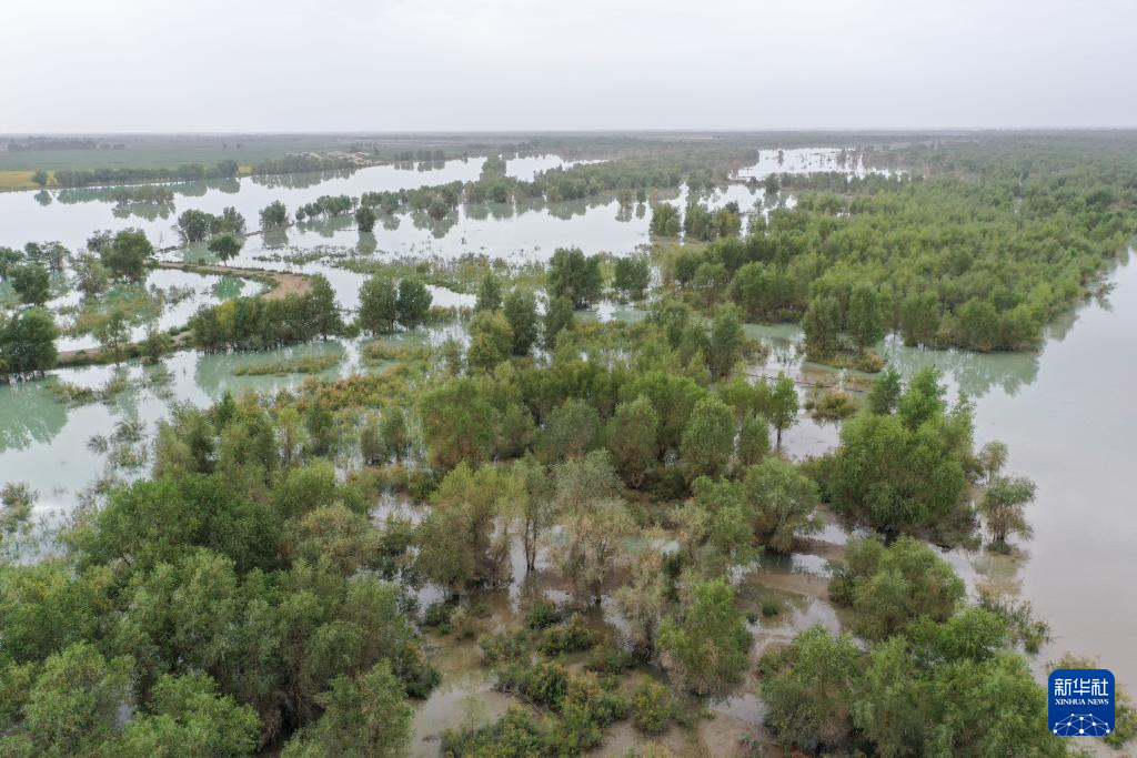8月1日拍摄的利用塔里木河洪水灌溉阿克苏地区沙雅县天然胡杨林的场景(无人机照片)。