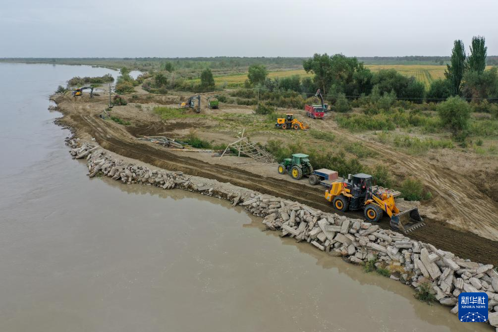 在新疆阿克苏地区沙雅县盖孜库木乡吐央村,抢险人员驾驶大型机械进行堤坝加固(8月3日摄,无人机照片)。