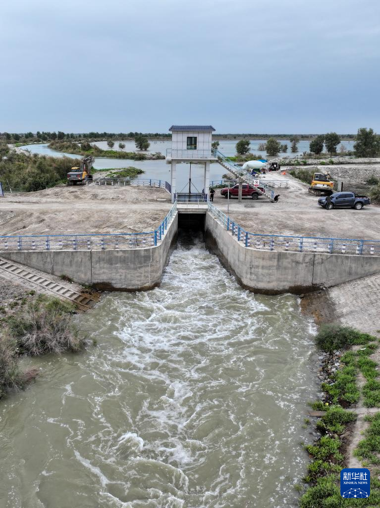 在新疆阿克苏地区沙雅县盖孜库木乡,一处生态闸在进行引洪灌溉胡杨林(8月4日摄,无人机照片)。