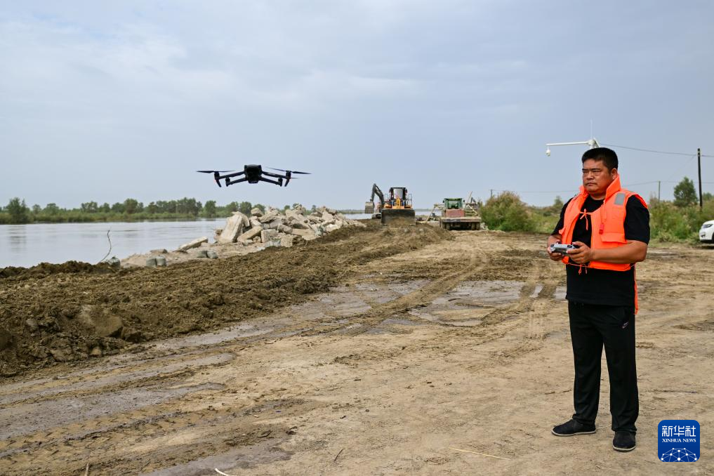 在新疆阿克苏地区沙雅县盖孜库木乡吐央村,抢险人员利用无人机进行巡查(8月3日摄)。