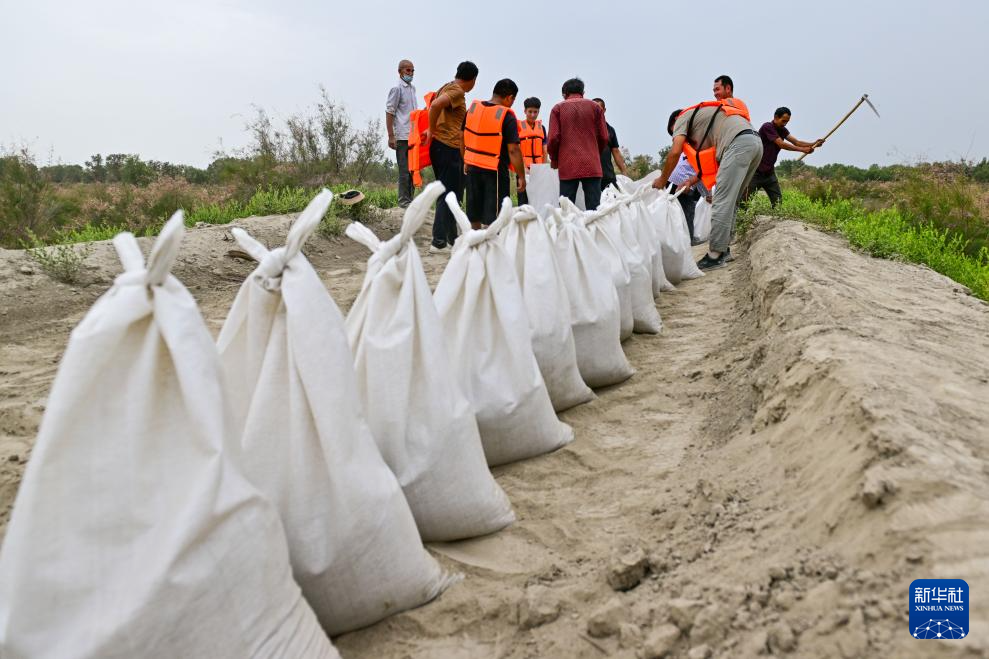 在新疆阿克苏地区沙雅县盖孜库木乡一处河堤除险加固现场,抢险人员在装运沙袋(8月3日摄)。