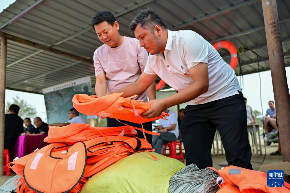 在新疆阿克苏地区沙雅县盖孜库木乡吐央村,抢险人员在整理防汛物资(8月3日摄)。