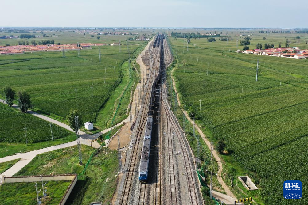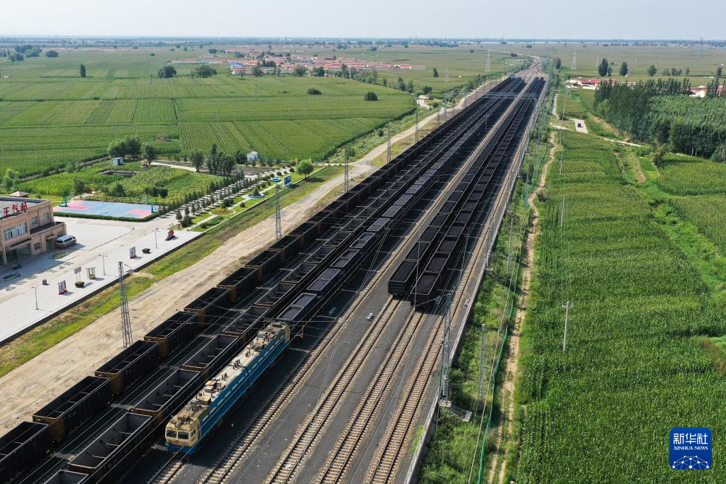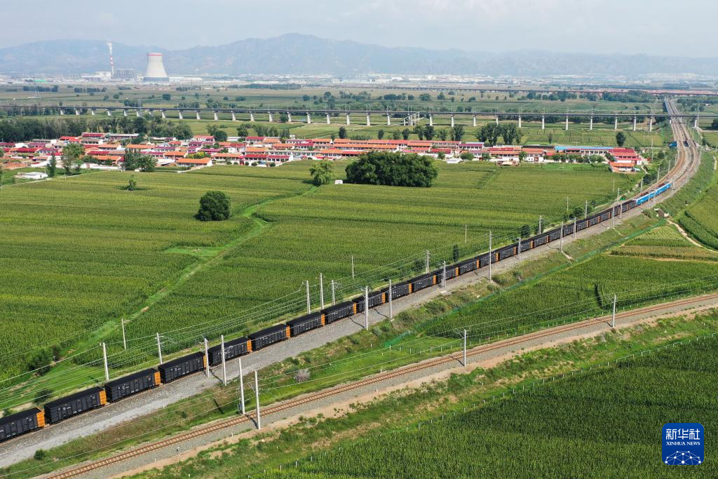 8月14日,一列运煤列车行驶在呼和浩特铁路物流中心王气营业室管辖的专用铁路上(无人机照片)。