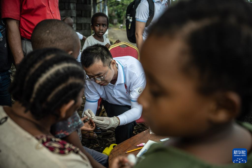 8月27日,中国抗疟团队在位于科摩罗首都莫罗尼北部的村庄内为村民采血化验。