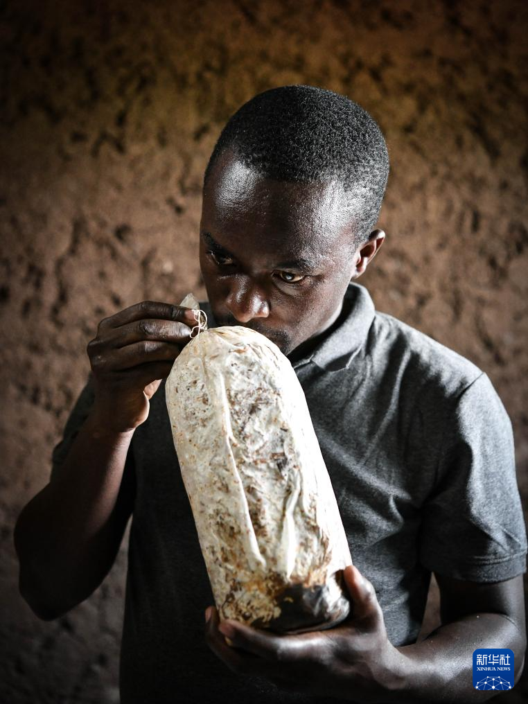 8月14日,在卢旺达南方省穆汉加区,尼扬博·奥贝德在食用菌培育工坊内检查菌袋。曾两次赴中国进行菌草技术培训的尼扬博·奥贝德在南方省和东方省各拥有一家工坊。