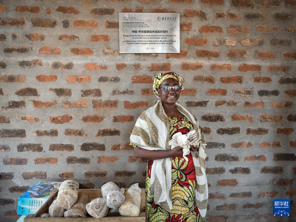 2月6日,在中非共和国达马拉,法蒂玛在食用菌培育工坊留影。2022年,法蒂玛在听说中国菌草专家在班吉传授技术后主动前往学习,从一间小菌棚起步,逐渐扩大为如今小有名气的合作社。