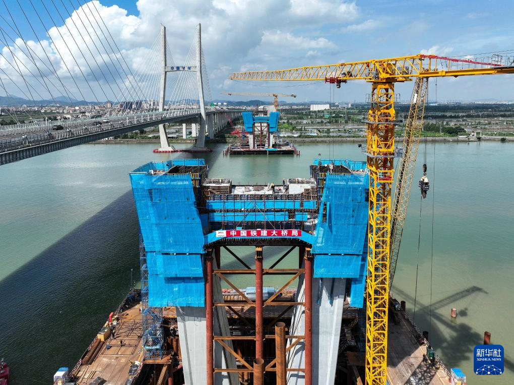 当日,中铁建大桥局承建的深江铁路关键性工程跨磨刀门水道主桥东主墩下横梁浇筑完成。该桥横跨中山和江门两市交界的西江磨刀门水道,主桥为140米高墩大跨斜拉桥,采用智能造塔机施工。