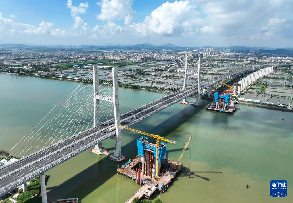 9月1日,深江铁路跨磨刀门水道主桥东主墩(左下)下横梁浇筑完成(无人机照片)。