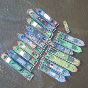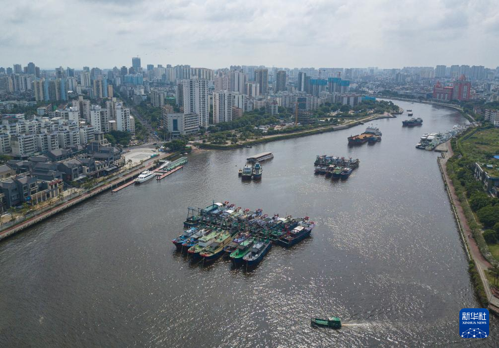 9月4日,船只陆续进入海南省海口市新港码头停靠避风(无人机照片)。