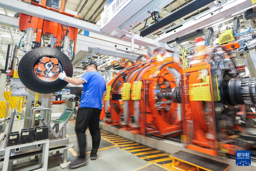 9月3日,在位于长春汽车经济技术开发区的吉林玲珑轮胎有限公司生产车间内,工人使用成型机加工轮胎产品。