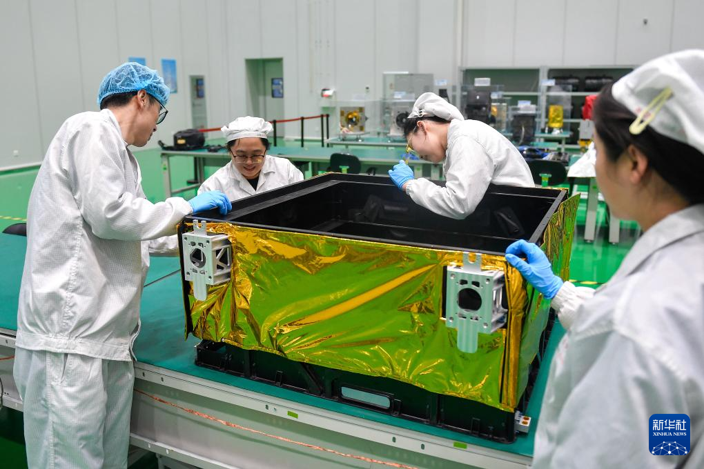 在吉林省长春市,长光卫星技术股份有限公司科研人员将制作完成的多层隔热组件包覆在卫星外壳部件上(4月2日摄)。