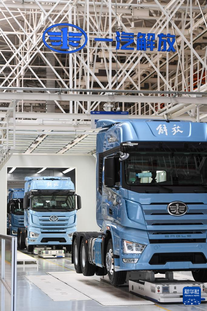 8月9日,在位于吉林长春的一汽解放汽车有限公司J7智能工厂内,AGV搬运机器人搬运车辆行进在生产线上。