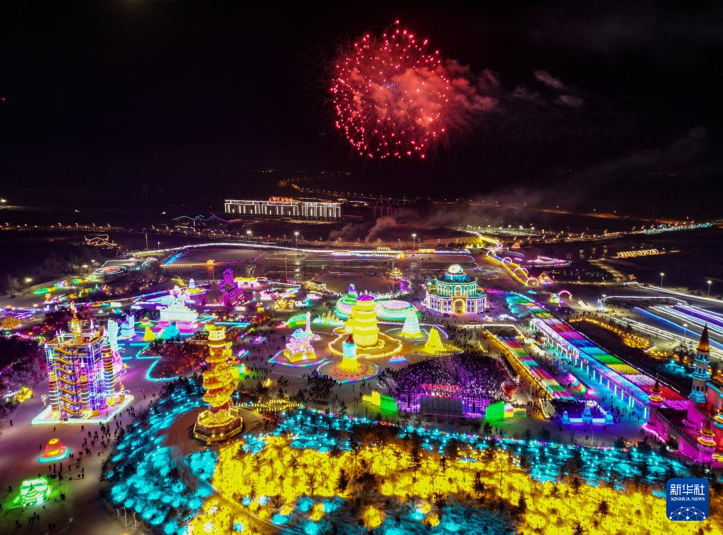 2月24日,游客在长春冰雪新天地欣赏冰灯和烟花表演(无人机照片)。