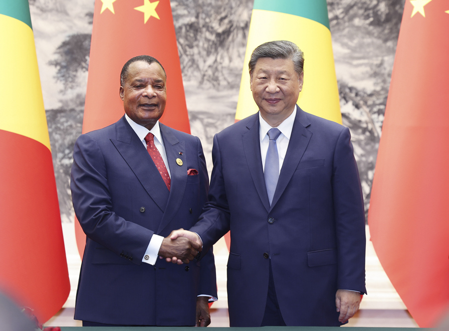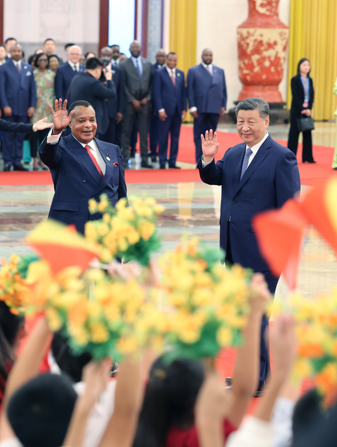 9月6日上午,国家主席习近平在北京人民大会堂同来华出席中非合作论坛北京峰会并进行国事访问的刚果(布)总统萨苏举行会谈。