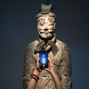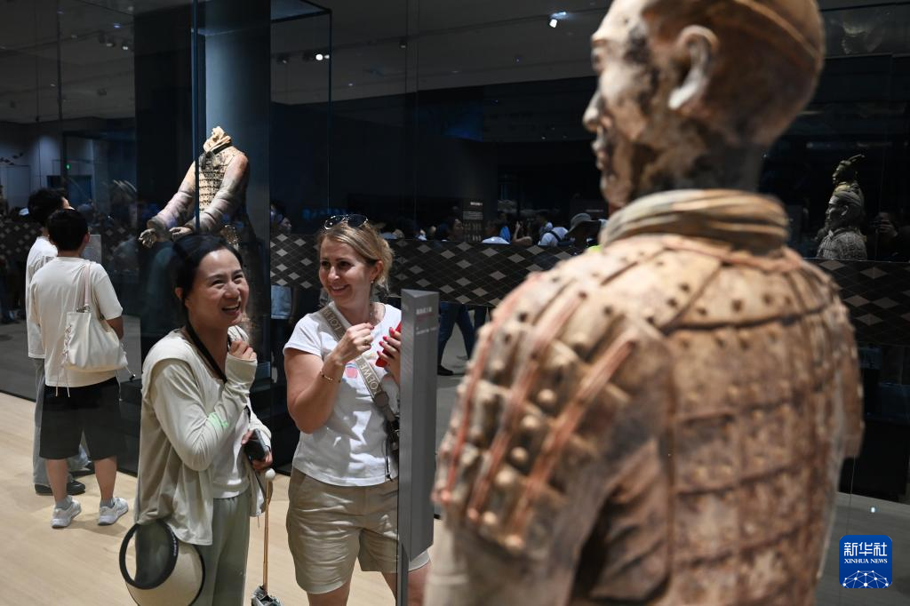 9月8日,在秦始皇帝陵博物院,观众在拍摄“千古一帝的地下王国——秦始皇陵考古发现展”上展出的兵马俑。