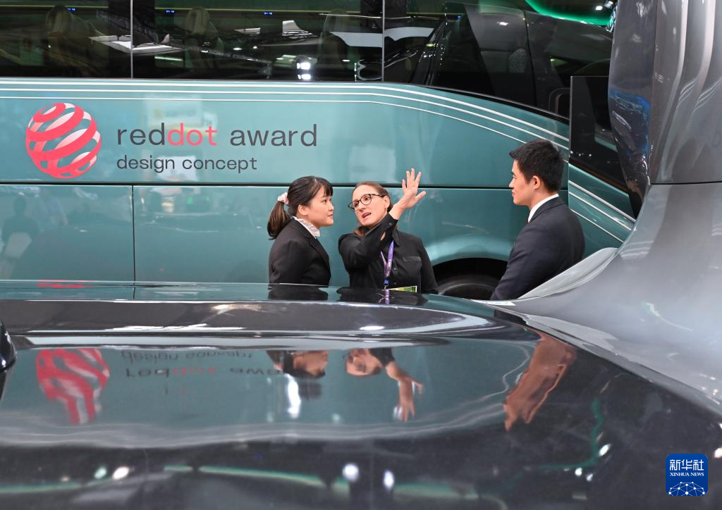 9月17日,在德国汉诺威国际交通运输博览会上,一名女子(中)在厦门金龙展区参观。