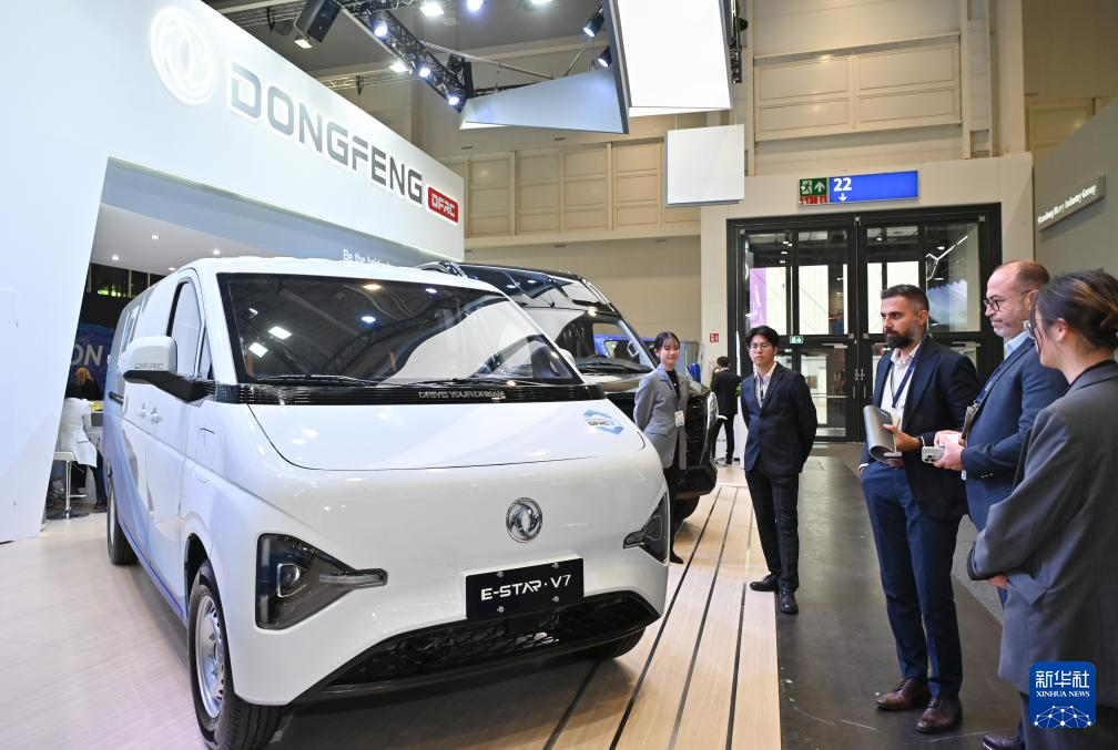 9月16日,在德国汉诺威国际交通运输博览会媒体预展上,人们在东风汽车展区参观E-STAR V7商用车。