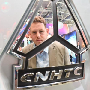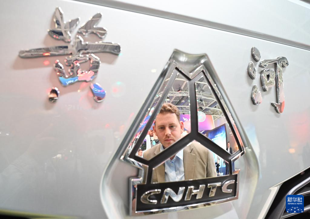 9月17日,在德国汉诺威国际交通运输博览会上,一名男子在中国重汽展区了解黄河X7氢燃料牵引车。