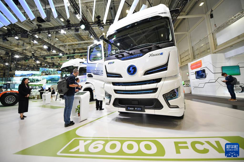 9月16日,在德国汉诺威国际交通运输博览会媒体预展上,参观者在陕汽控股展区了解一款氢燃料电池牵引车。