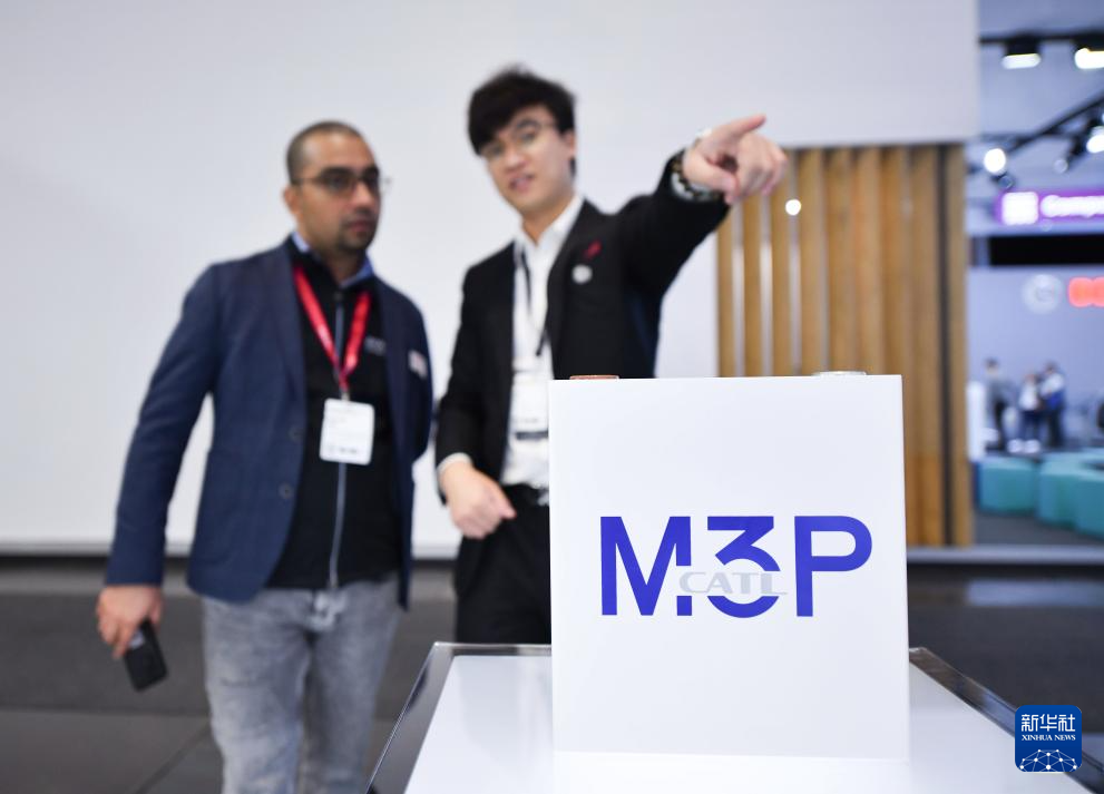 9月16日,在德国汉诺威国际交通运输博览会媒体预展上,宁德时代工作人员(右)向参观者介绍展品。